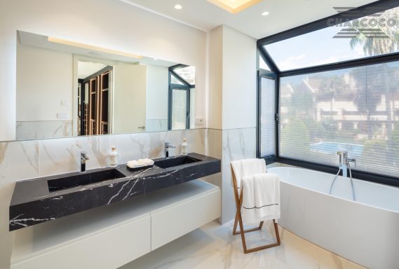 A seamless flow between exterior and interior areas, set the stage for the quintessential easy- going Mediterranean lifestyle. Surrounded by luscious tropical gardens, the large infinity swimming pool receives all the spotlight, giving the home an oasis feeling. The design principle for this contemporary estate is being at one with nature, complementing the needs of the changing seasons while making the most of Marbella’s micro-climate. Every angle of the living/bedrooms areas have been thoughtfully designed to maximise its views, over the landscaped grounds towards La Concha and the Mediterranean sea.