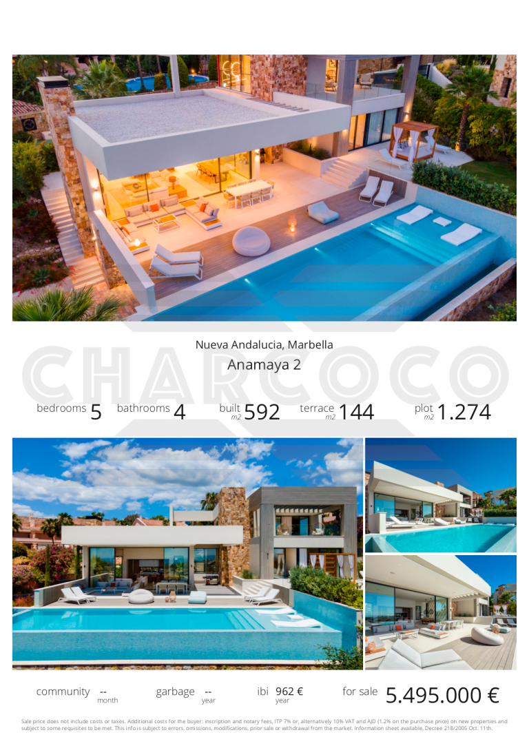 Set within a development of 5 brand new luxury villas, Anamaya 2 enjoys an elevated position within the prestigious Golf Valley of Nueva Andalucia, providing scenic mountain and sea views. Designed with a contemporary touch, Anamaya 2 has been impeccably set to face the magnificent panoramic views towards the Mediterranean Sea, all the way to the African coastline.