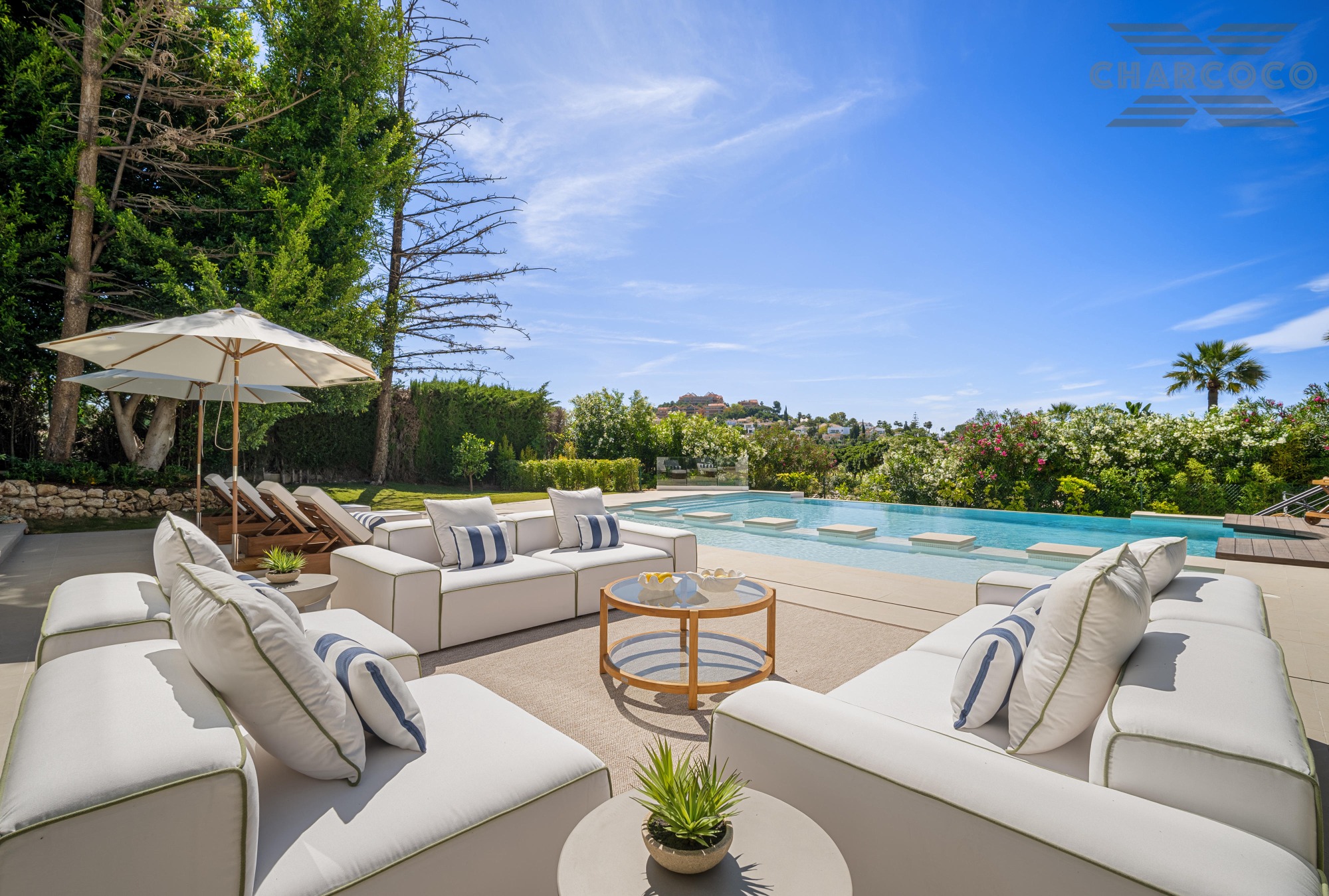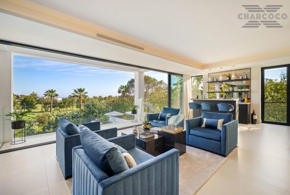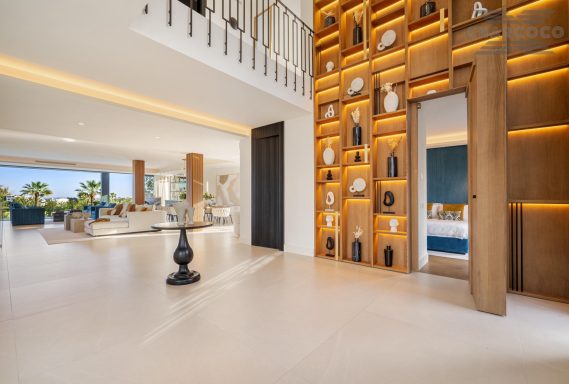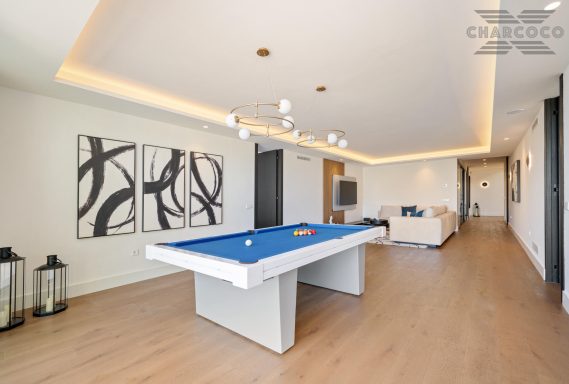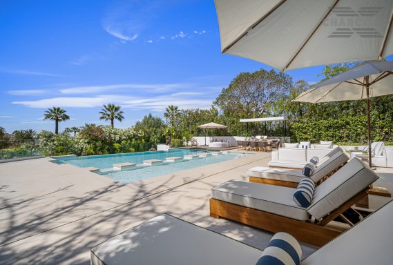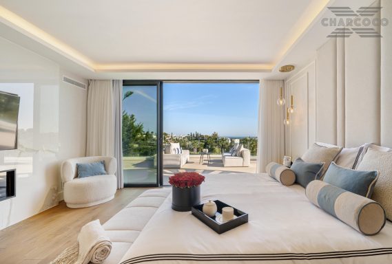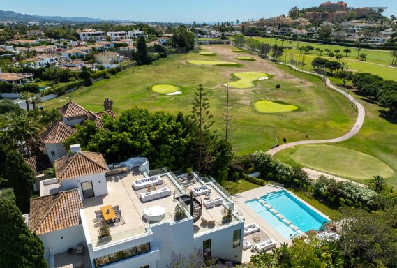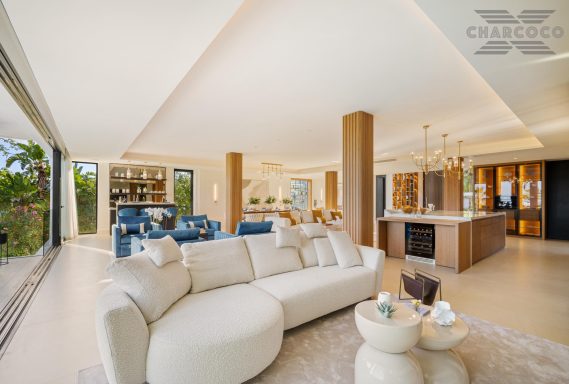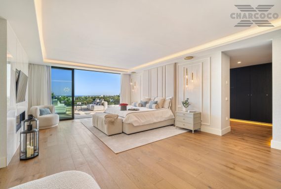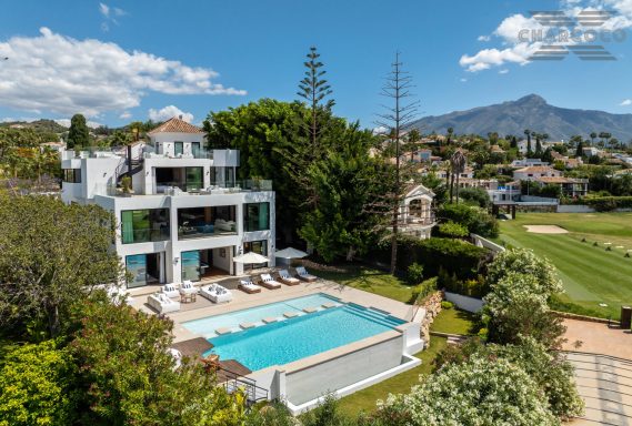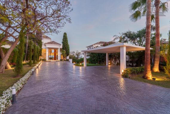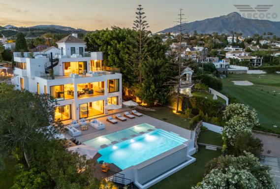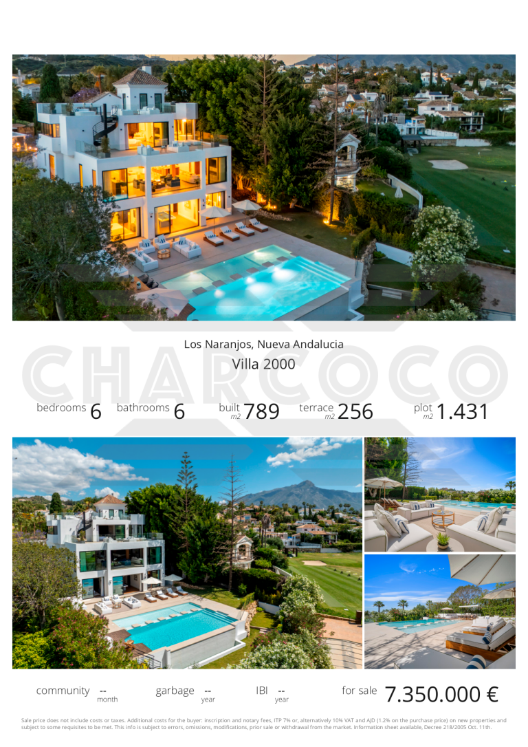 Wide-ranging windows effortlessly direct you towards the terraces and infinity pool surrounded by tropical trees and mature gardens. Villa 2000 comes complete with 6 distinctive bedrooms; the elegant master suite compromises the entire first floor with large walk-in closets, an elegant marble bathroom with an rounded bathtub, an office room and access to the spacious private terrace offering beautiful sea views. Enjoy one of Marbellas most distinctive properties on the market, from its decked out rooftop terrace, complete spa and private gym, indoor pool, cinema room and its own putting green area. The villa includes an elevator, a garage fit for 2 cars and a carport fitting 2 further cars.