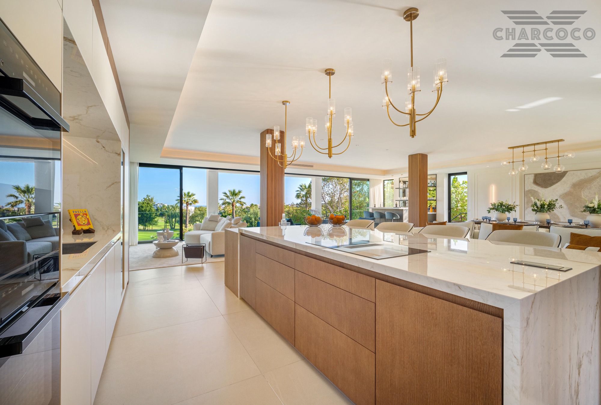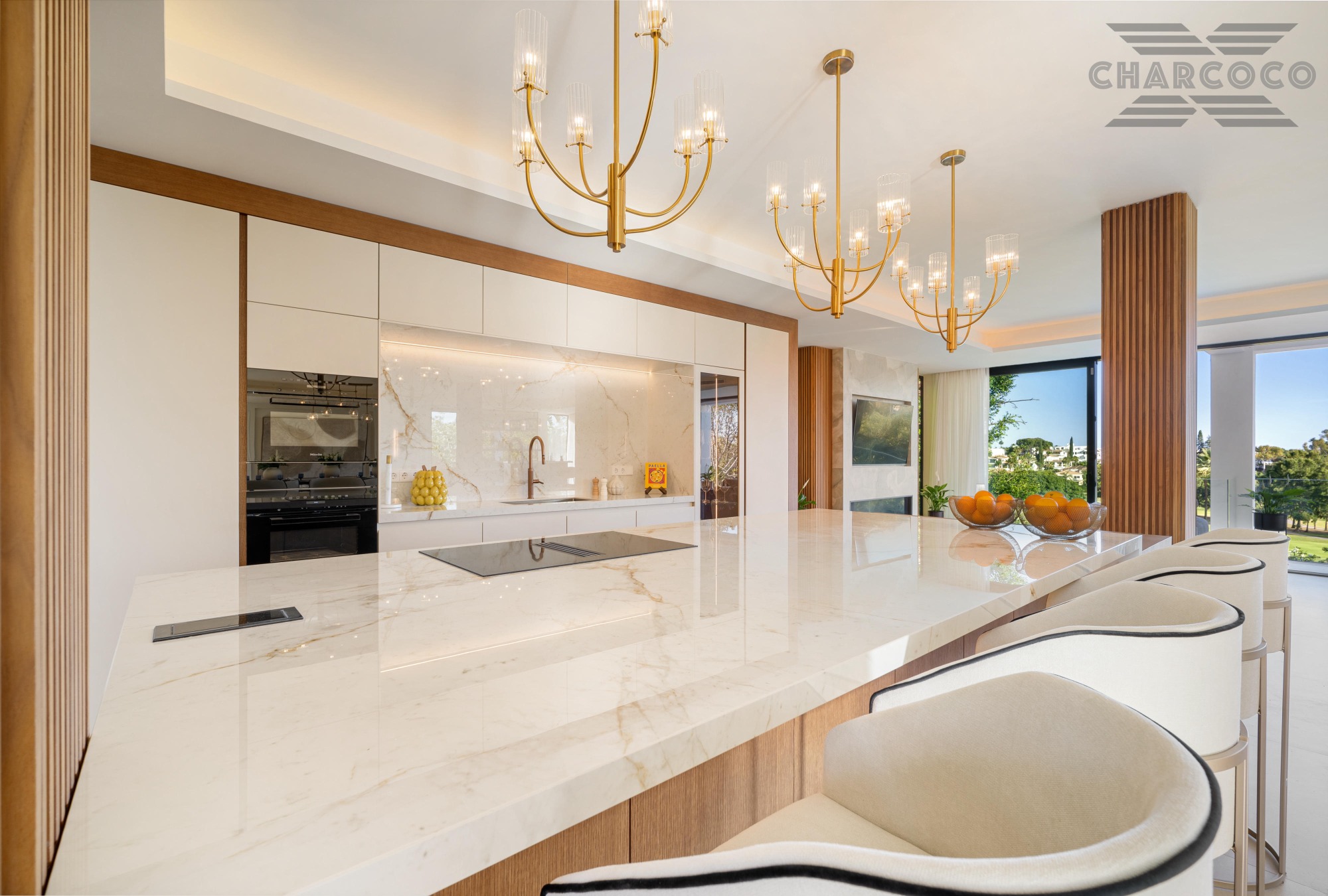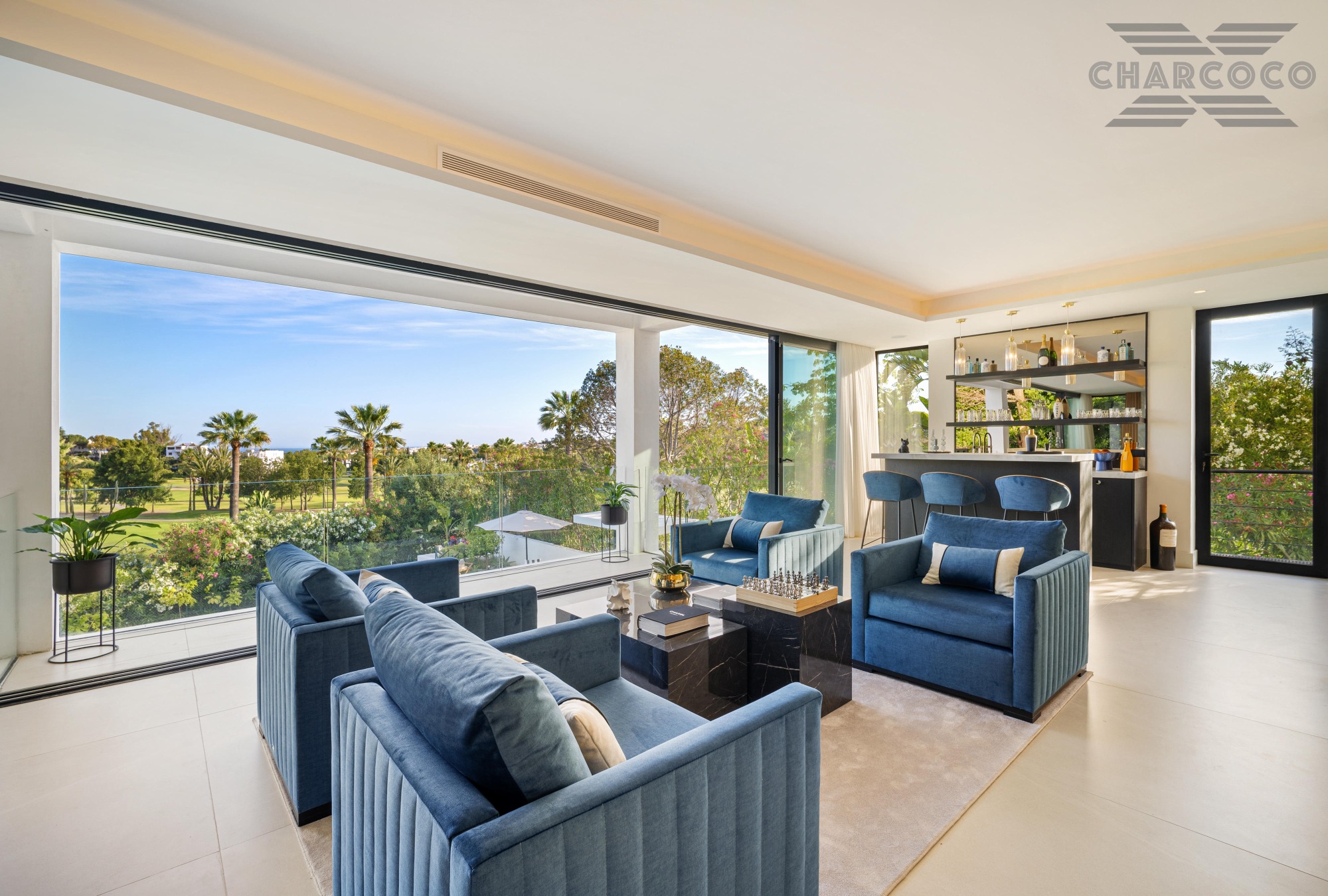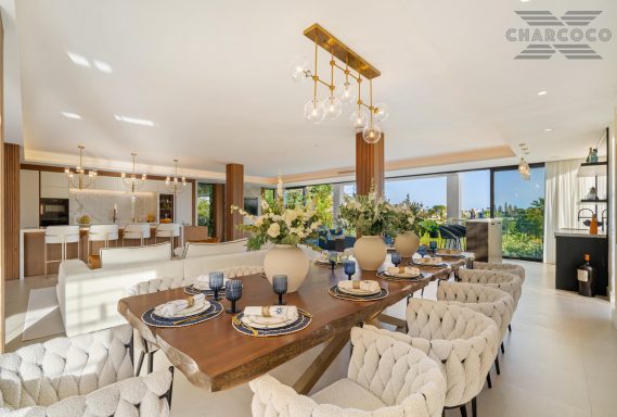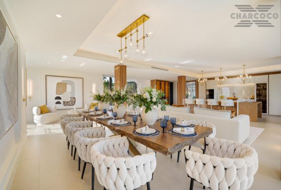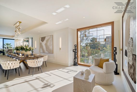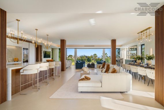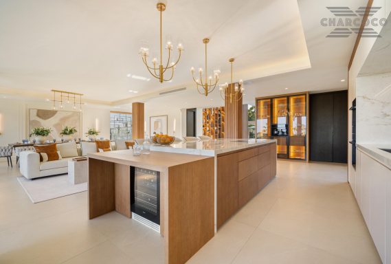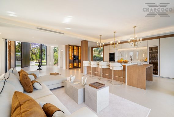Boasting of unparalleled architecture and unrivalled construction quality, Villa 2000 offers sophisticated and contemporary living, sitting on a private plot within a secure community with breathtaking front-line panoramic views towards Los Naranjos Golf course. Villa 2000 enjoys a highly privileged position in one of Marbellas most coveted areas, surrounded by a wealth of amenities, from restaurants, sports centres, supermarkets and just a few minutes away from the beach and famous Puerto Banus. This unique villa boasts of 5 floors of state-of-the-art features throughout. Welcoming you into an expansive living area, complemented by a custom designed gourmet kitchen, complete with a large natural stone island with seating and an exclusive wine cabinet.