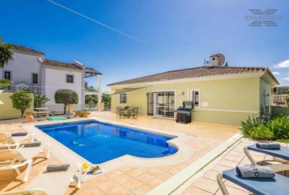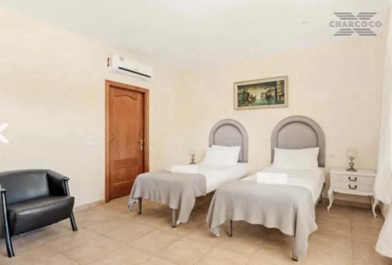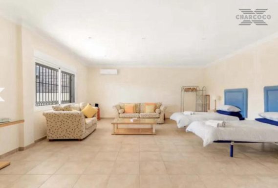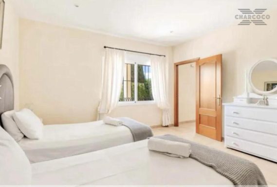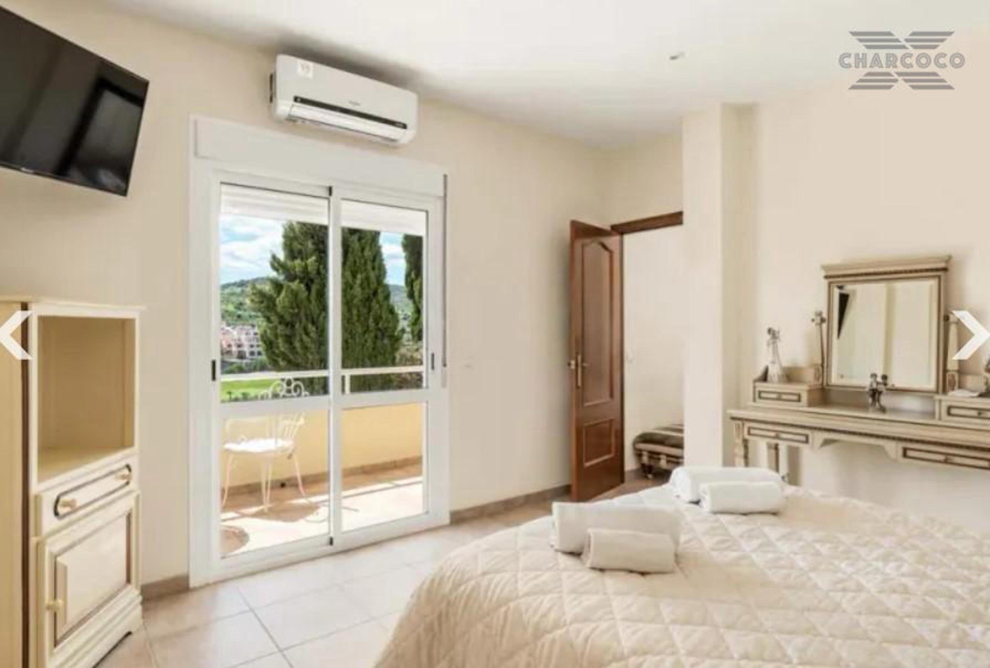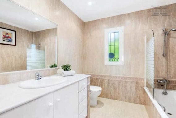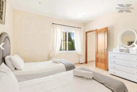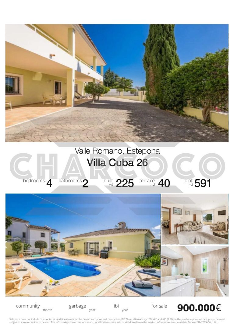 Villa Cuba 26 is in a prime location within the popular area of Valle Romano, which in recent years has seen property prices almost double. Valle Romano is just a 7 minute drive to Estepona Town Center, and just 30 minutes from Marbella, with Malaga airport just 80km and Gibraltar airport at 40km. It is located in a residential area that is next to an area in full urban expansion, with the new "High Resolution Hospital" of Estepona, commercial area with supermarkets, restaurants and pharmacy a few minutes away. It has a fantastic southwest orientation, so it enjoys long hours of sunshine. Upon entering the plot, we find a large parking area, up the stairs on the side of the house, we find a large solarium with a large private pool with salt chlorination, the main entrance of the house is located at this height of the house, accessing the property we find a spacious living room with a lovely fireplace that makes the room a very cozy place, next to the entrance, if we turn left, we find its spacious fully equipped kitchen with very good qualities and finishes. Upstairs we have 2 of the 4 bedrooms, each bedroom is located on one side of the living room both are spacious and double, with access to the large terrace that enjoys beautiful panoramic views of the golf course and partial sea views.