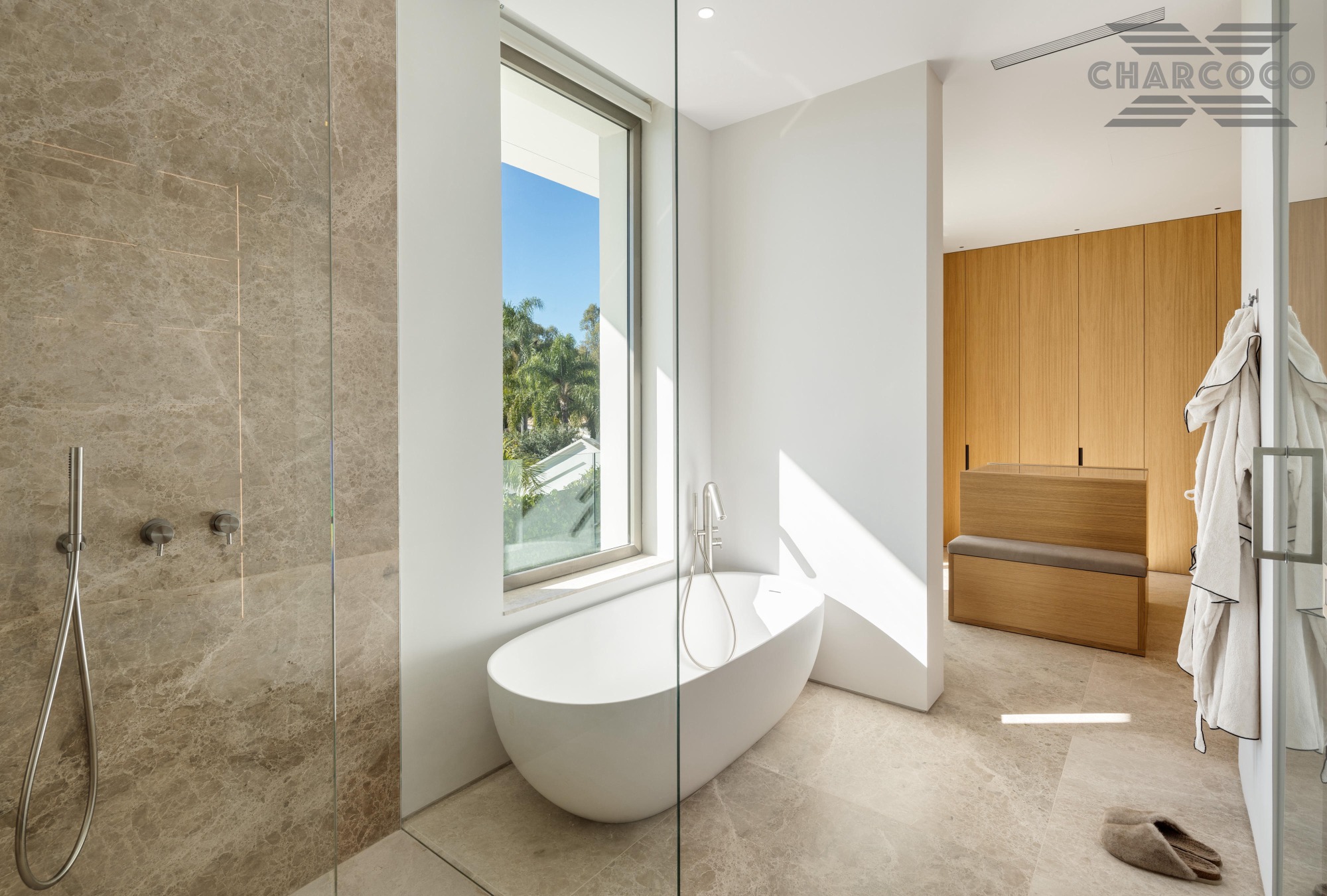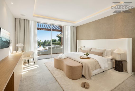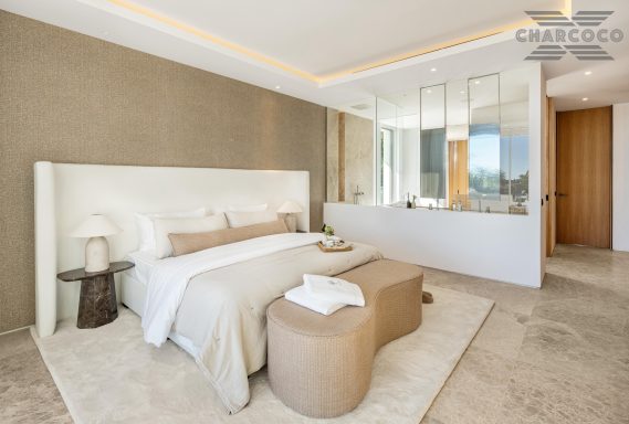 Inside, the villa boasts an open-plan layout enhanced by a soothing neutral palette and abundant natural light. The modern kitchen is equipped with state-of-the-art appliances, while expansive glass doors lead to generous terraces, inviting the beauty of outdoor living. With five luxurious bedrooms, including a stunning master suite with terrace access, a walk-in wardrobe, and a stunning bathroom, every detail is crafted for comfort and style.
