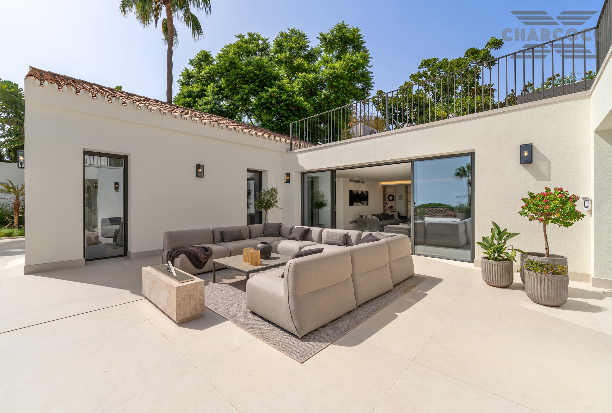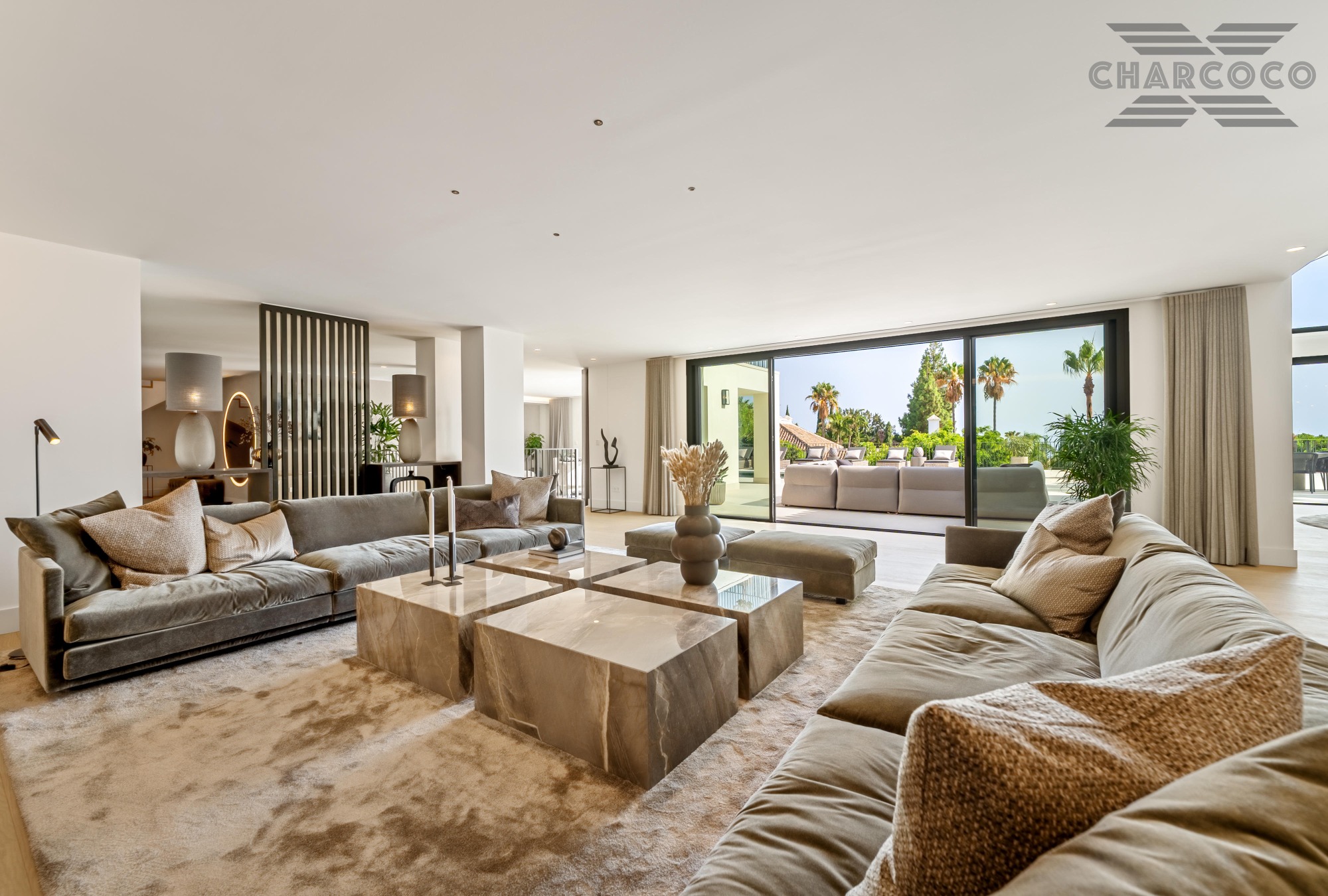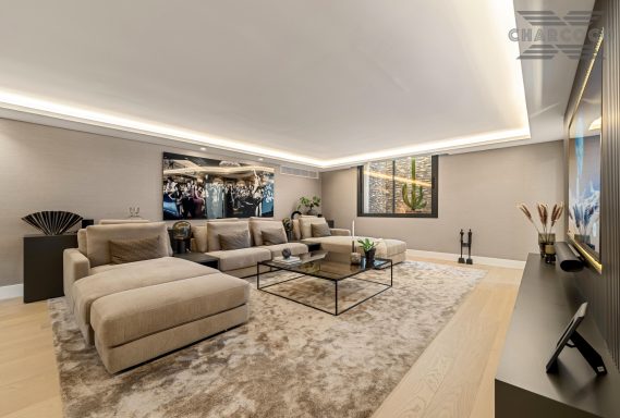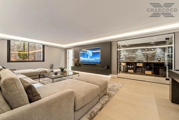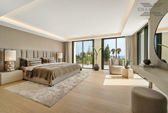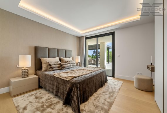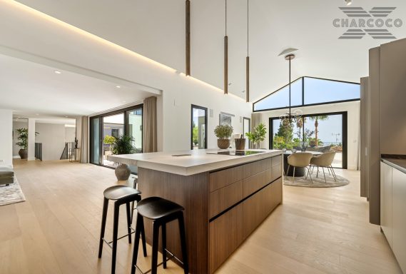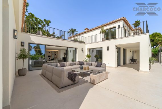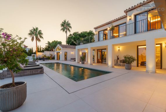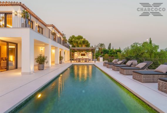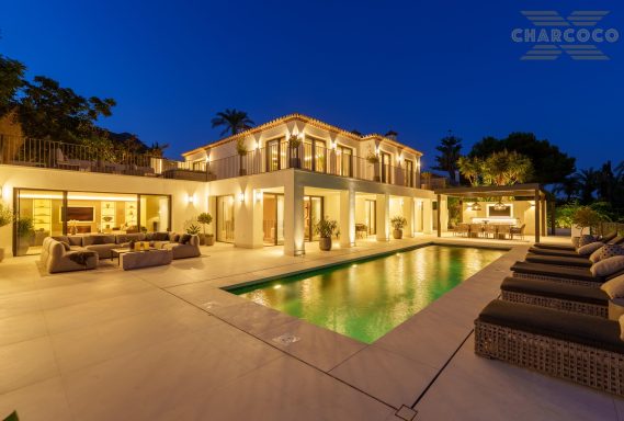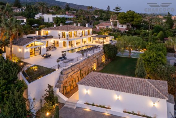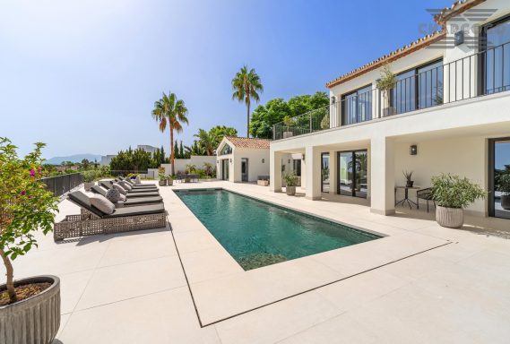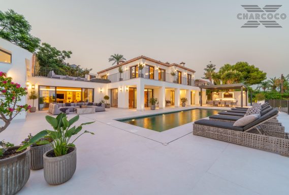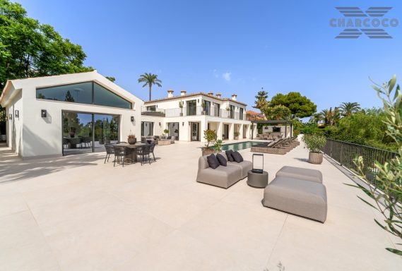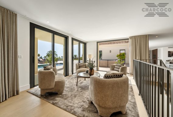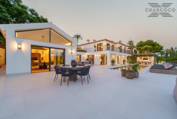 Villa Rocío is a fully renovated Andalusian-style residence located in Rocío de Nagüeles on Marbella’s prestigious Golden Mile. Set on a 1,965m2 south-facing plot beneath La Concha, the property enjoys open views of the Mediterranean. Modernised in 2025, the villa spans 734m2 of light-filled interiors, where full-height glazing, vaulted ceilings, and seamless indoor-outdoor transitions frame the scenic surroundings.