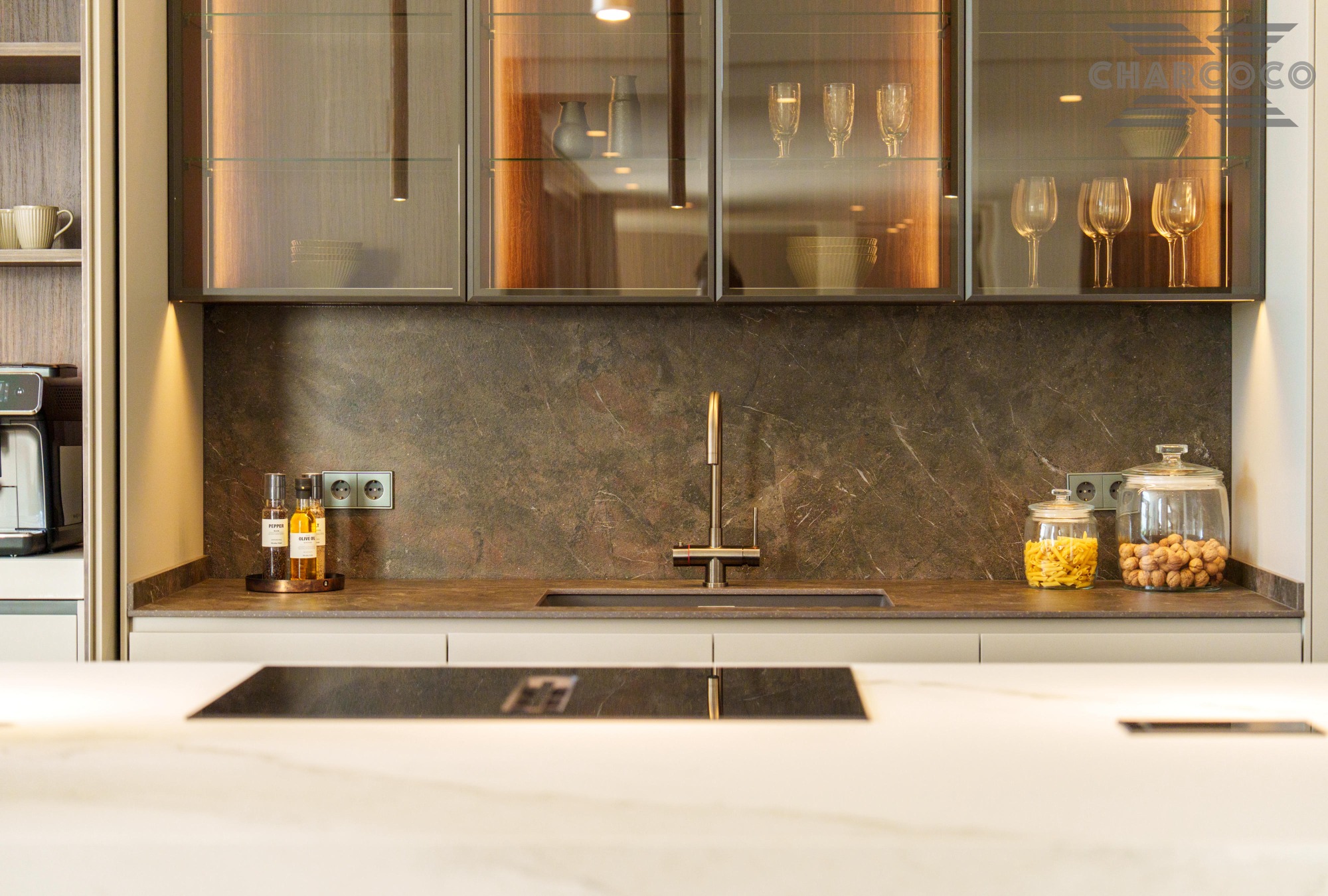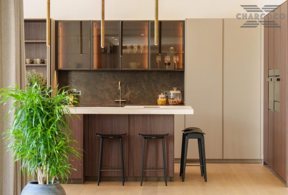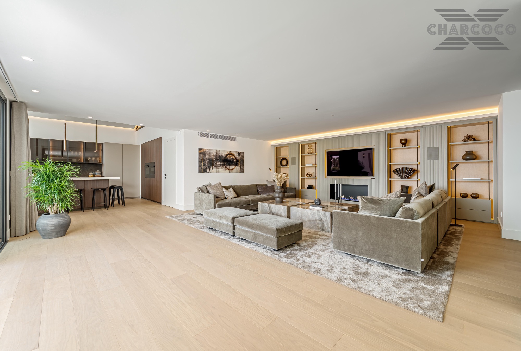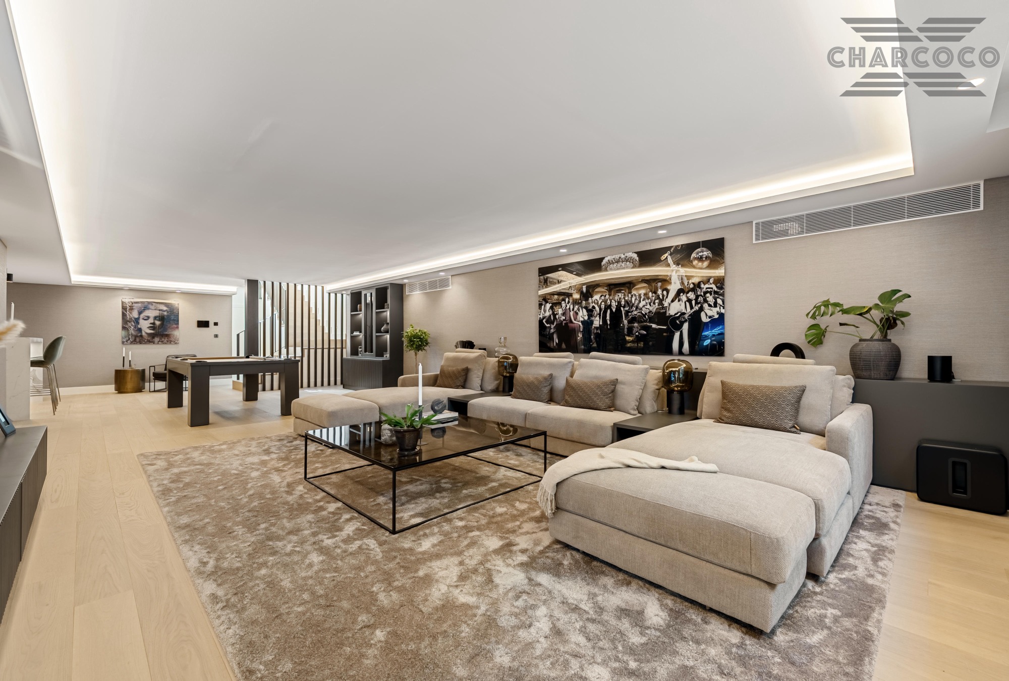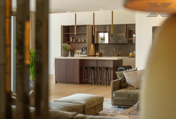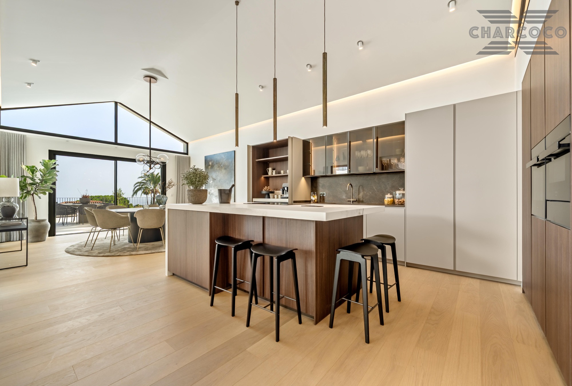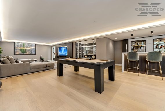Inside, a spacious open-plan living and dining area wraps around a striking statement kitchen with central island. Five generous bedroom suites provide refined accommodation, including a panoramic principal suite with a private terrace and walk-through dressing room. The lower level offers a sleek entertainment lounge complete with a bar, glass-fronted wine cellar, and billiards table, complemented by two guest WCs and ample storage space.