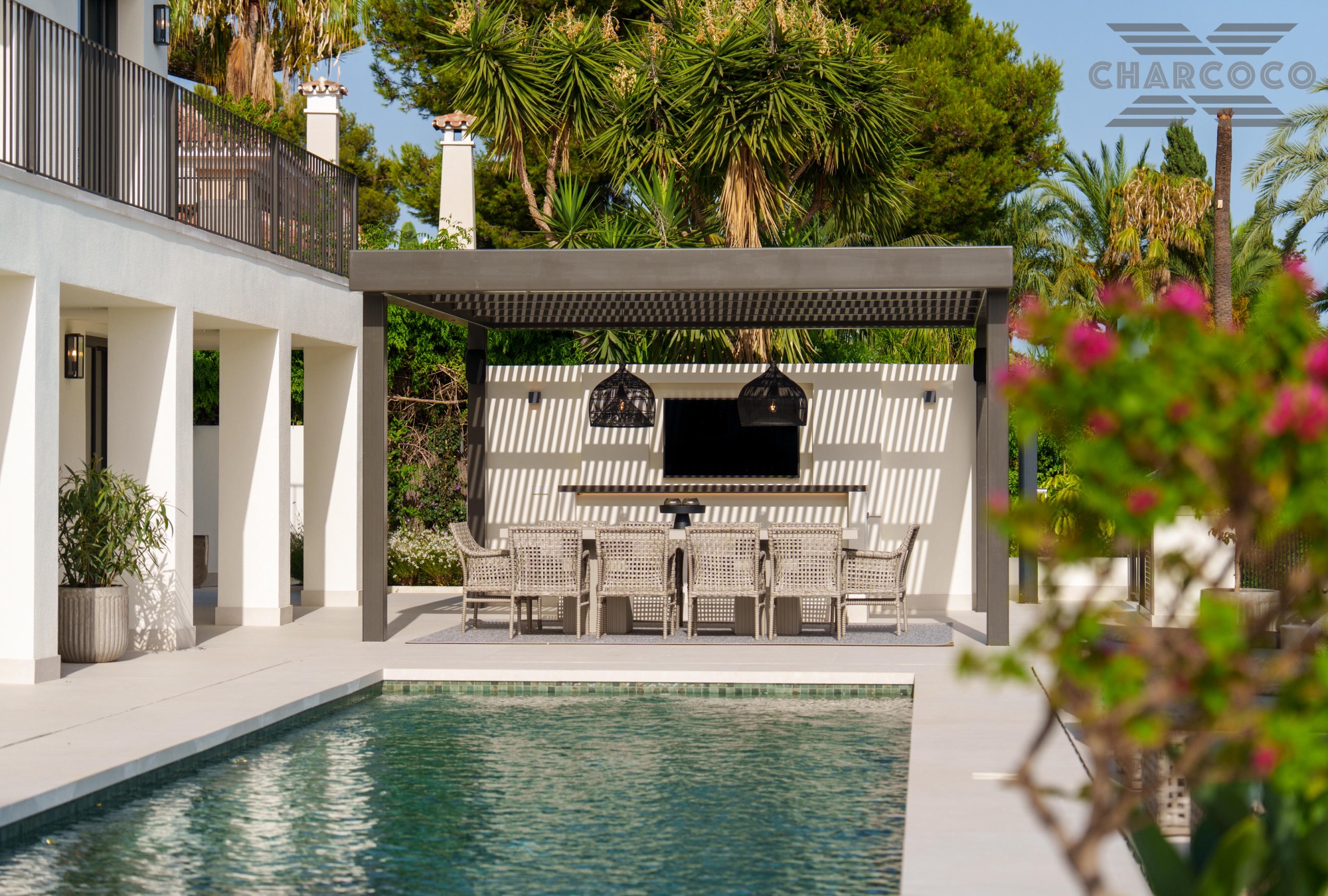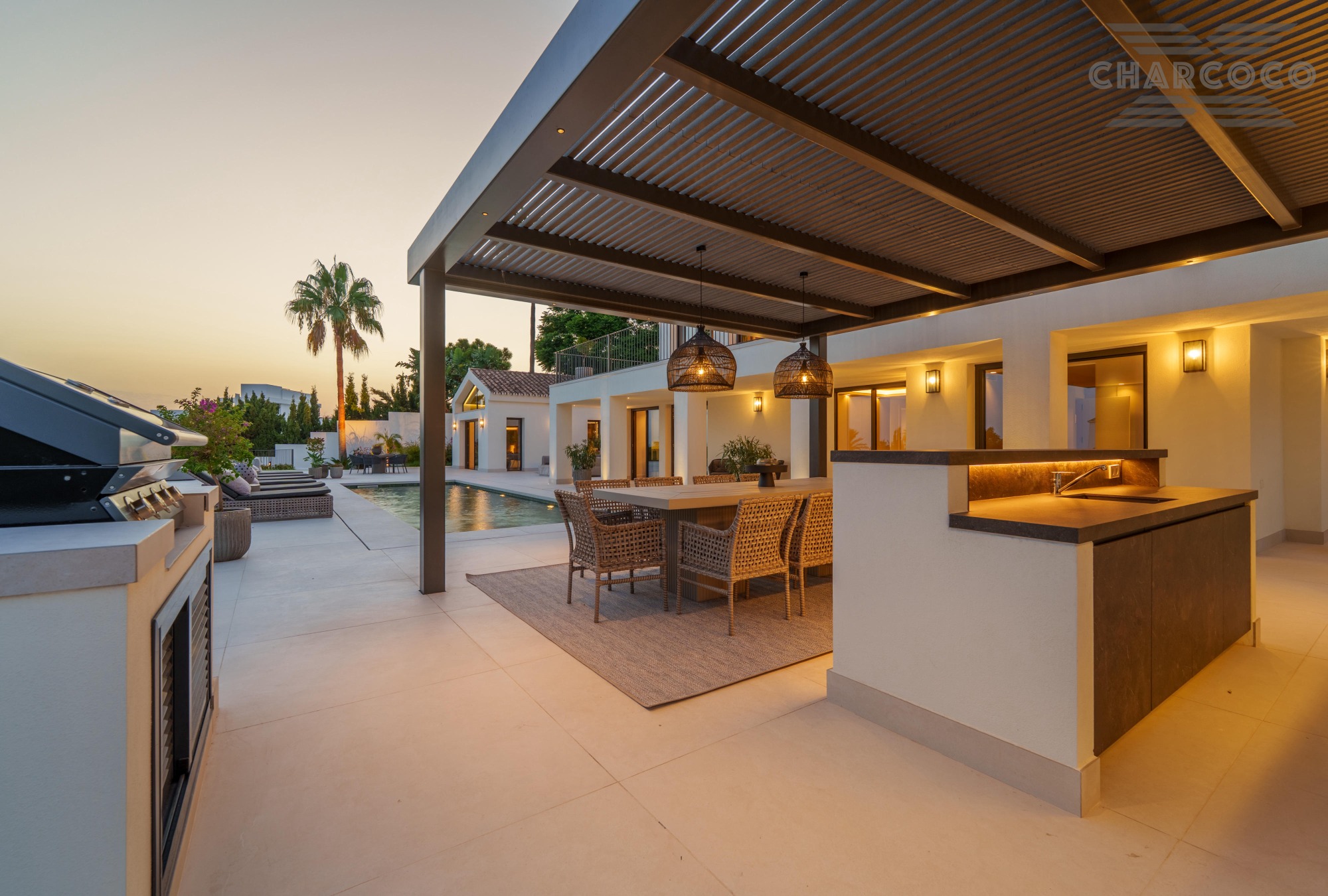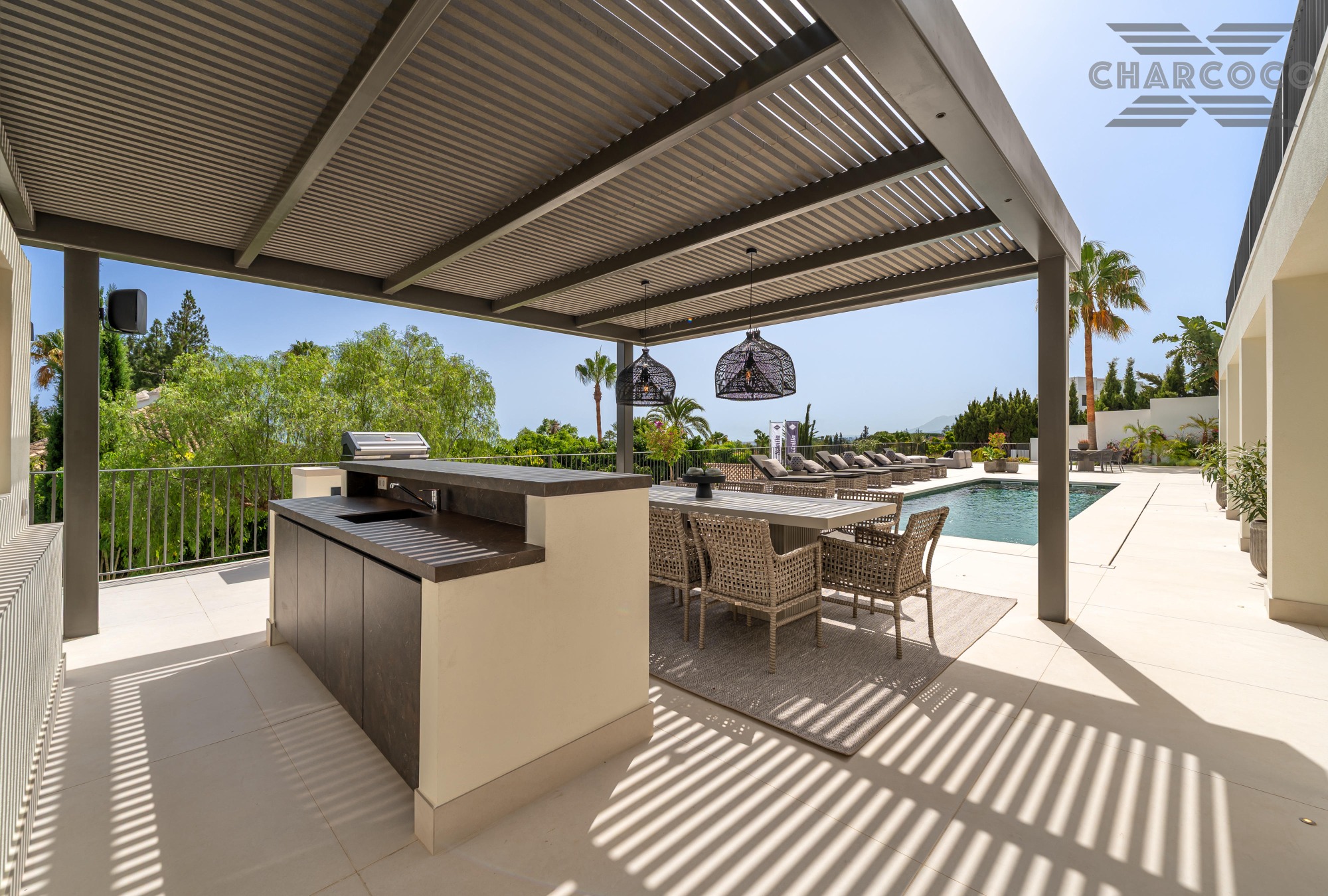 Outdoors, 456m2 of terracing surrounds a large saltwater pool, sun deck, al fresco dining area, and landscaped gardens. A covered carport behind gated access provides parking for six vehicles. Turn-key and south-oriented, Villa Rocío is just minutes from beach clubs, golf courses, and all the amenities of Marbella’s Golden Mile, delivering contemporary luxury in one of the coast’s most sought-after locations.