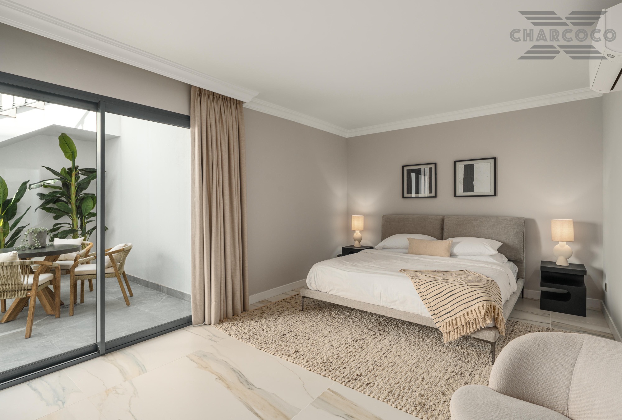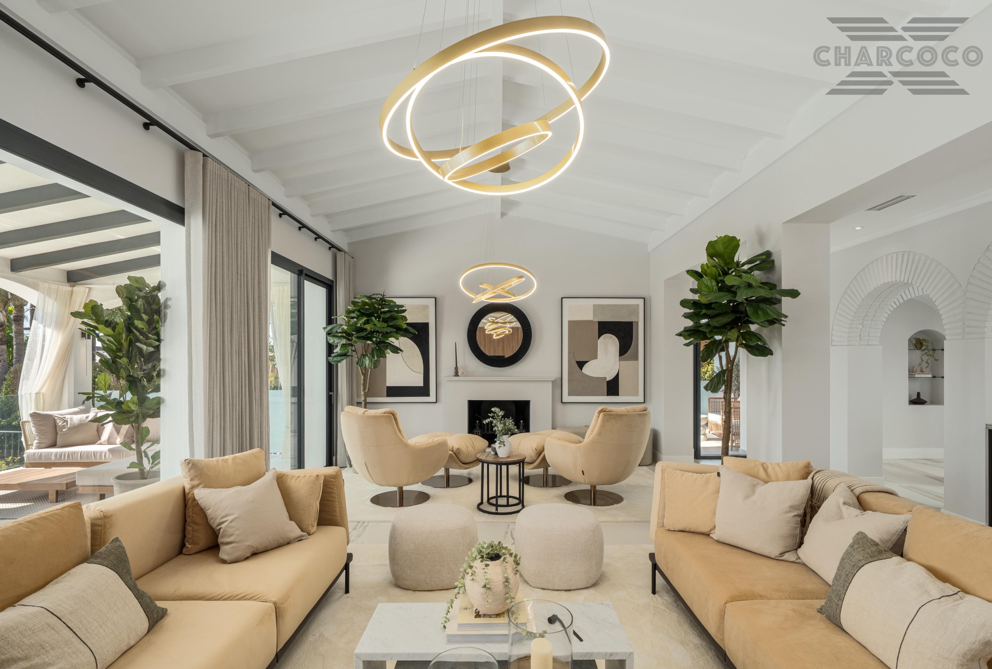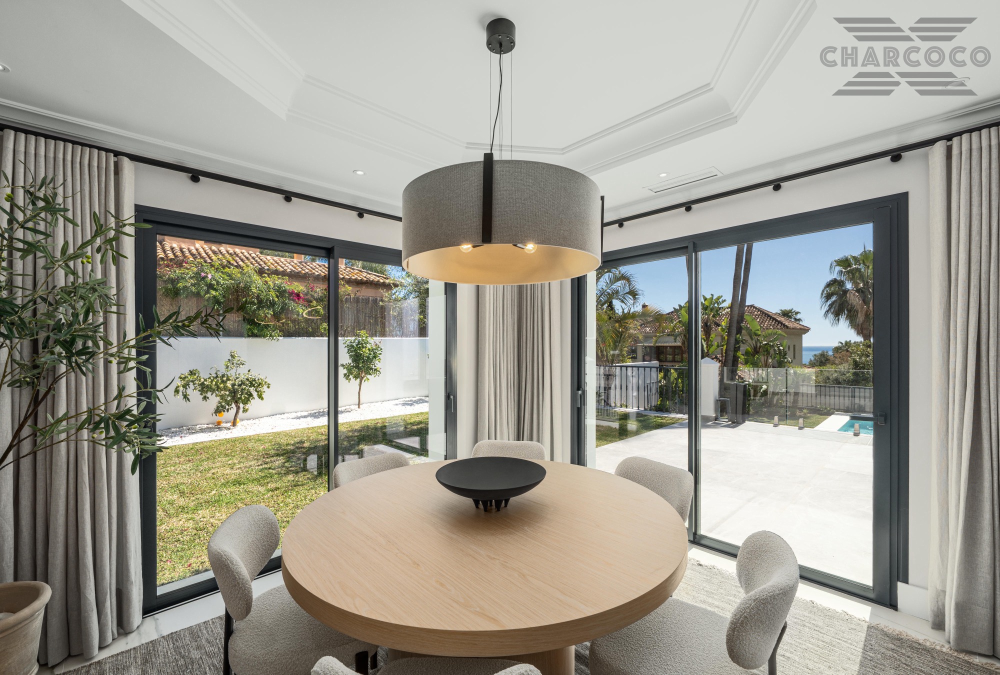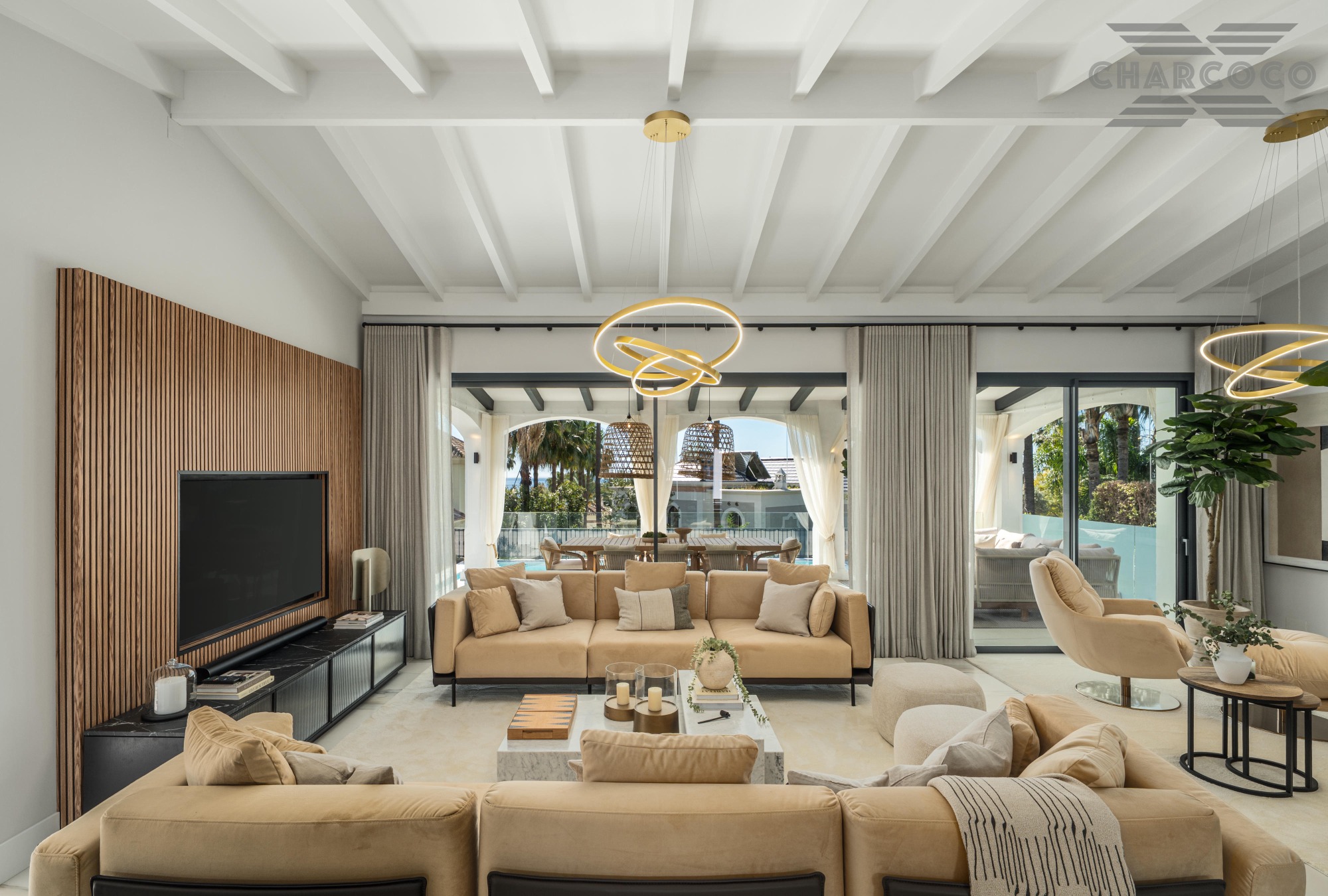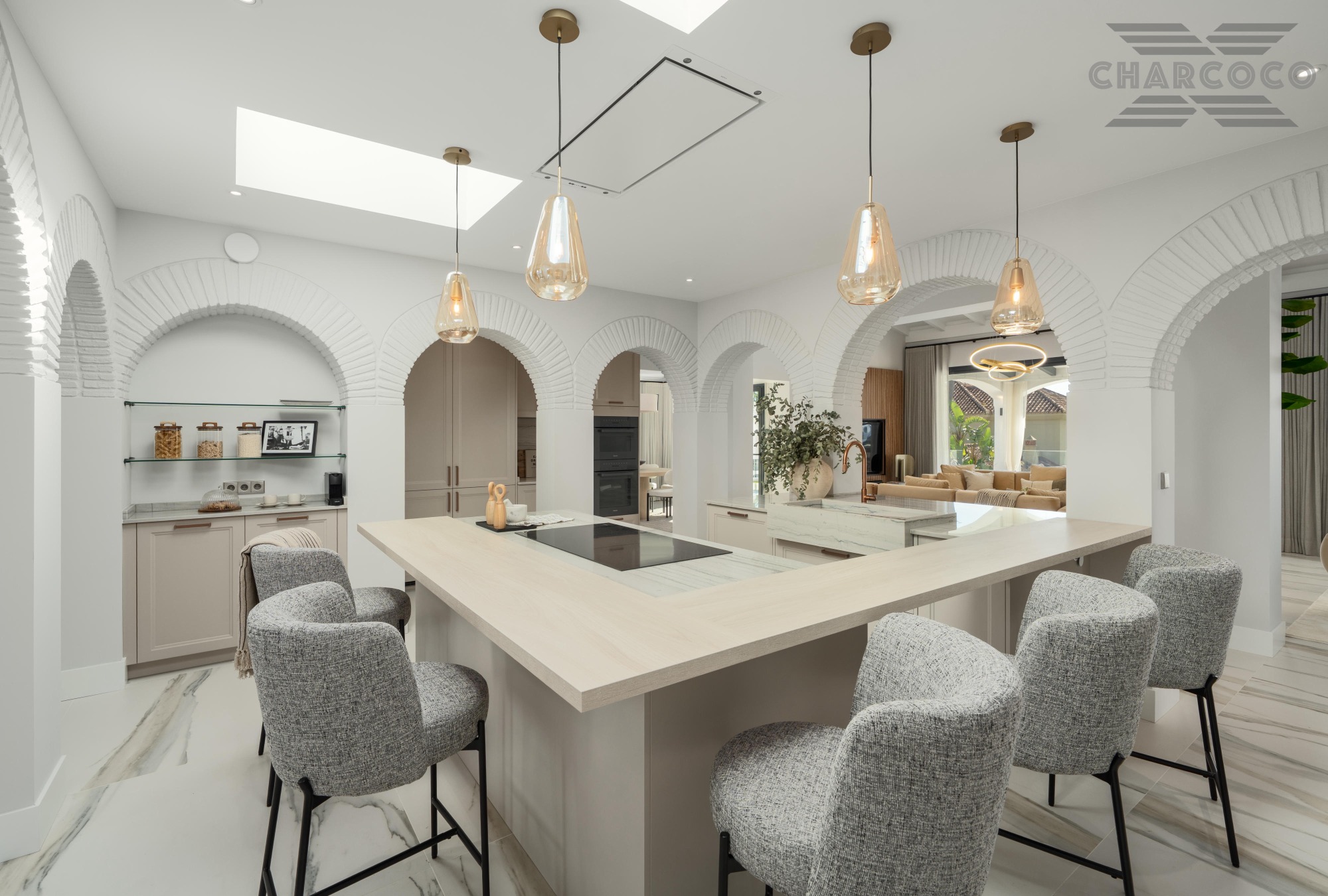 The interiors of Villa Zafira are a testament to impeccable design, featuring a soothing neutral colour palette that enhances the sense of serenity upon entry. Mediterranean architectural elements are celebrated throughout, with elegant arches gracefully separating the living spaces while maintaining a fluid, open-plan feel. The living area exudes sophistication, boasting high ceilings adorned with white-painted wooden beams that highlight the villa’s Andalusian heritage. The kitchen is both stylish and functional, fitted with top-of-the-range appliances and centred around a striking island that doubles as a cooking space and an intimate dining area.