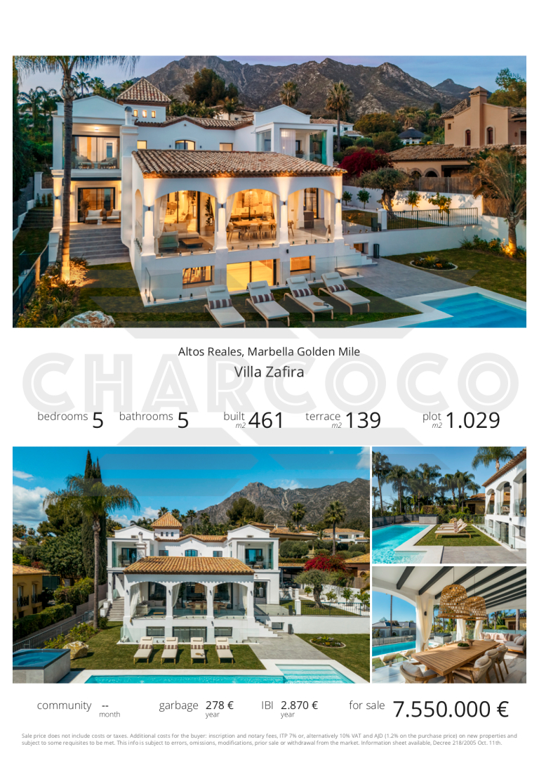 Villa Zafira is a charming Mediterranean retreat that seamlessly blends traditional charm with refined contemporary touches. Sitting on a generous plot of over 1,000m2 in the prestigious gated community of Altos Reales on Marbella’s Golden Mile, this exceptional property offers an oasis of tranquillity and luxury. Its beautifully manicured gardens provide a lush setting for relaxation, complete with a private swimming pool and an inviting outdoor Jacuzzi. The expansive terraces are thoughtfully designed for outdoor entertainment, ensuring every gathering is framed by the surroundings of this prime location.